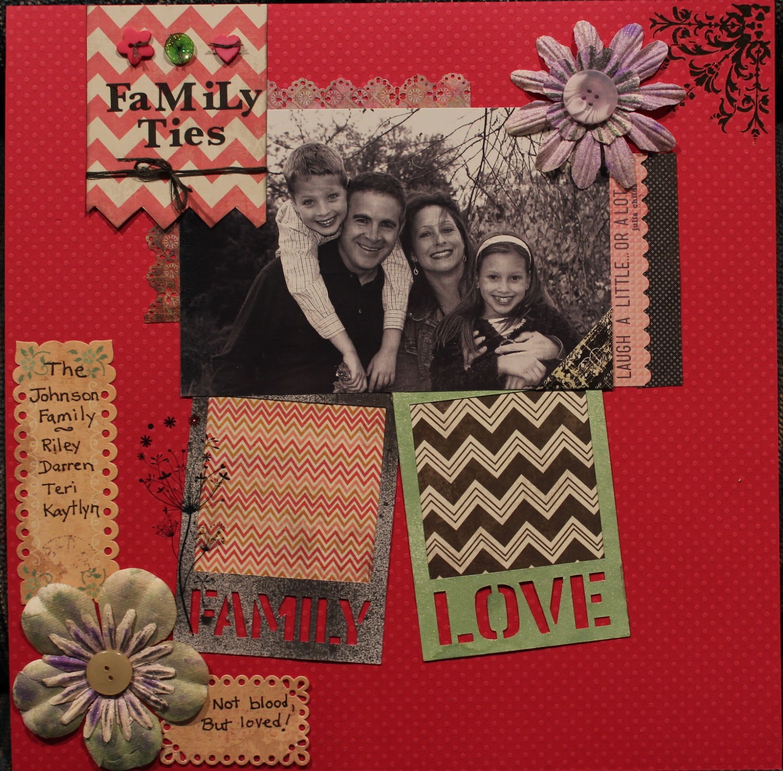 For my Friends That Scrap Wk. 10 Challenge, I did the following layout. We were given a sketch and we had to choose one of the following: tearing, chalking, stamping, misting; and 3 from the following list: 5+ buttons, 8+ pattern paper, bling, glitter, 5+ eyelets, rub-ons. On this layout, I misted the two frames and also the flowers. Then I used 5+ buttons, 8+ pattern paper and rub-ons. The family pictured are part of our extended family.